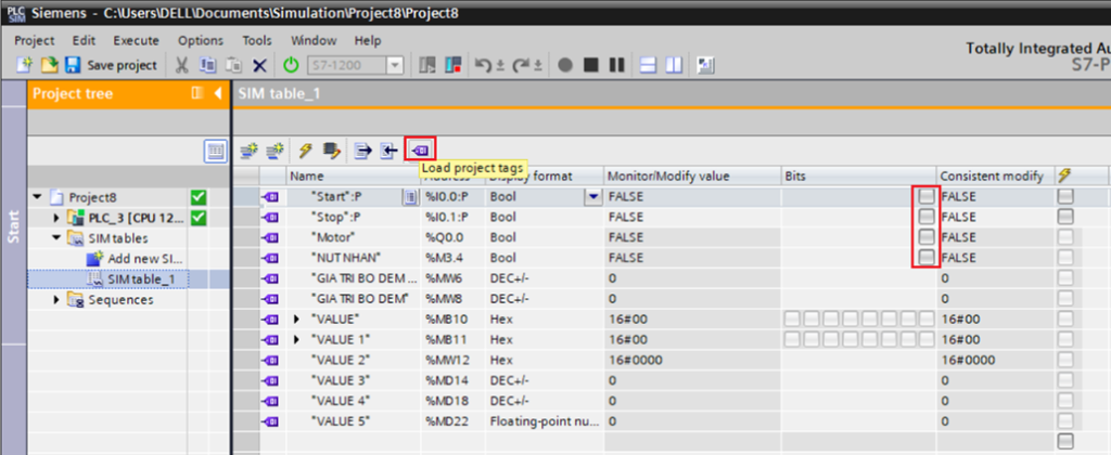 Bước 9:Load project tags và tick những ngõ vào cần lên on, hoặc bỏ tick những chân cần xuống off.