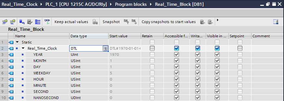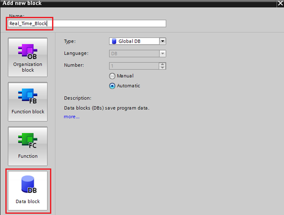 Bước 1: Tạo khối data block DB, đặt tên là Real Time Block