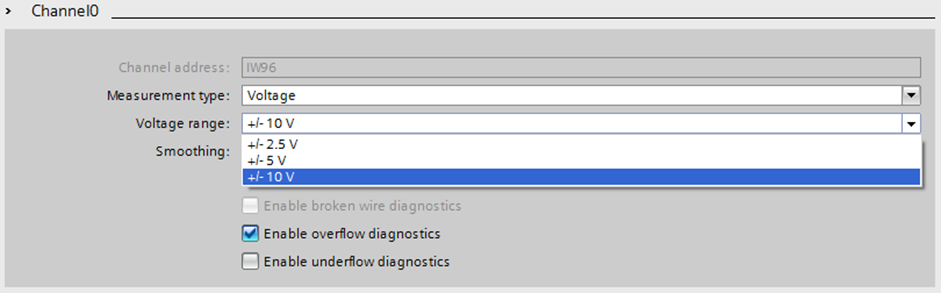 Nếu chọn ngõ vào điện áp: Voltage range chỏ thể lựa chọn: +/-10V, +/-5V, +/- 2.5V